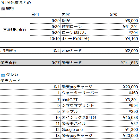 ※楽天カード支払い金額は利用期間とずれるため、今回は除外しています。